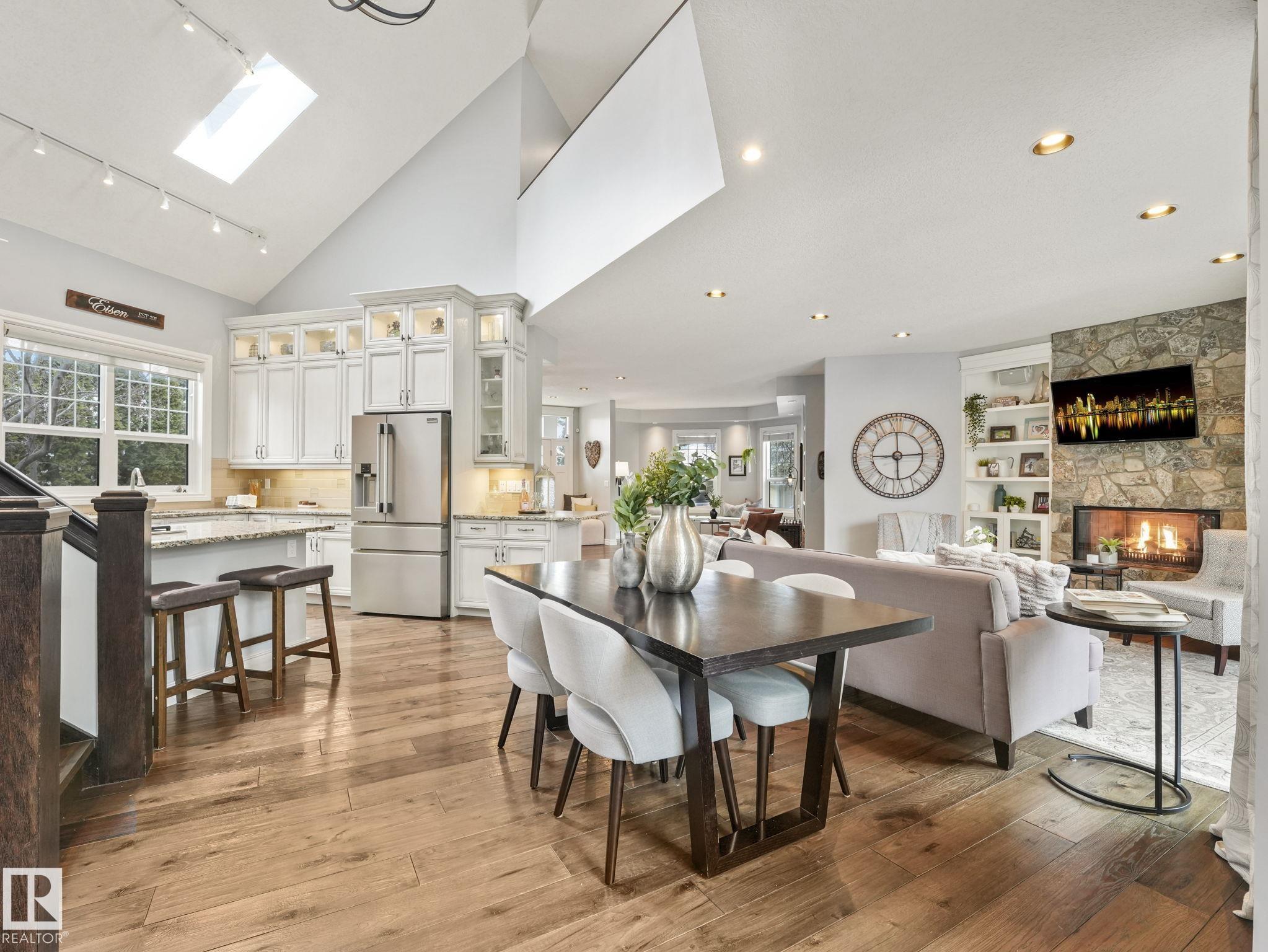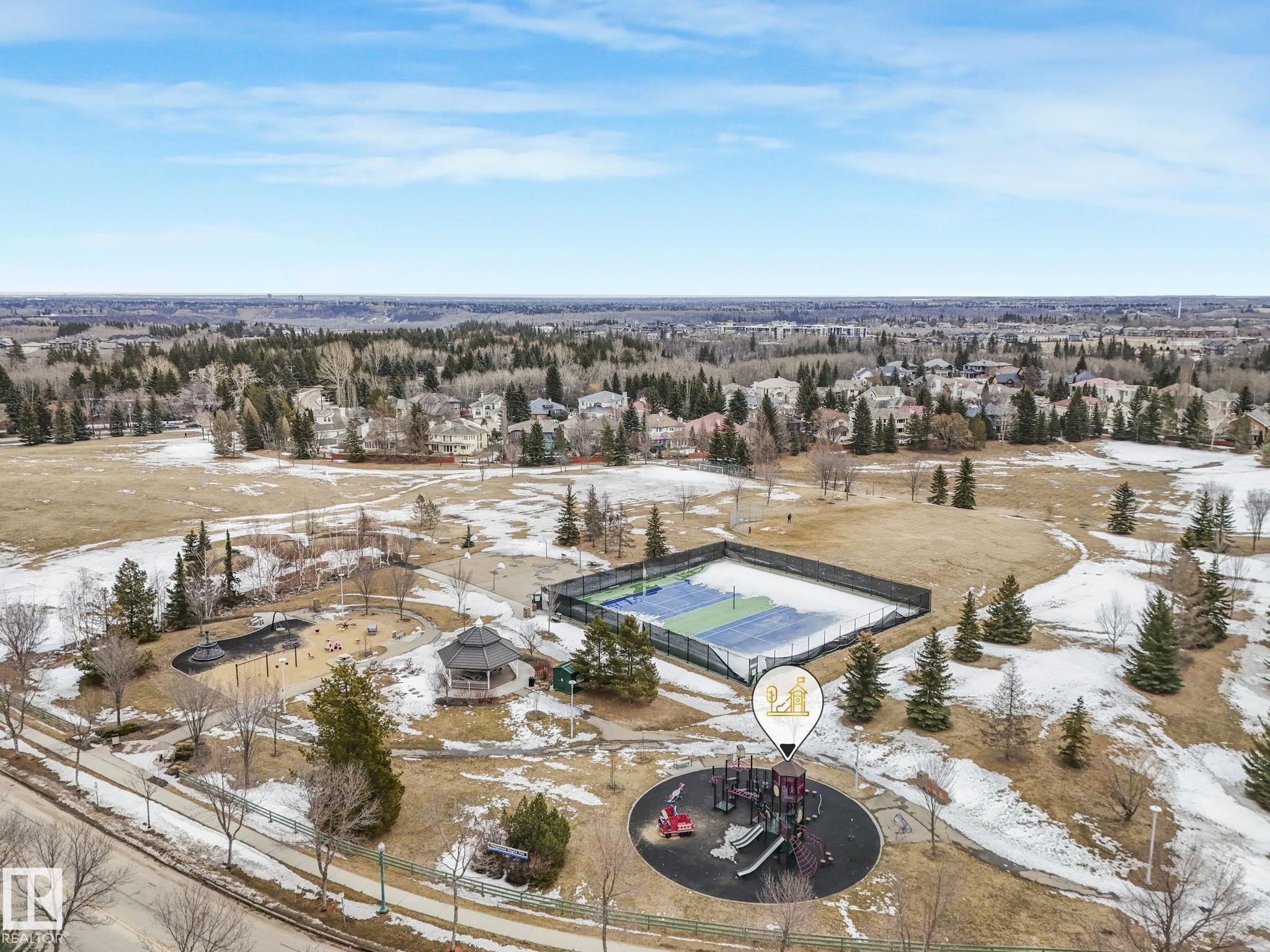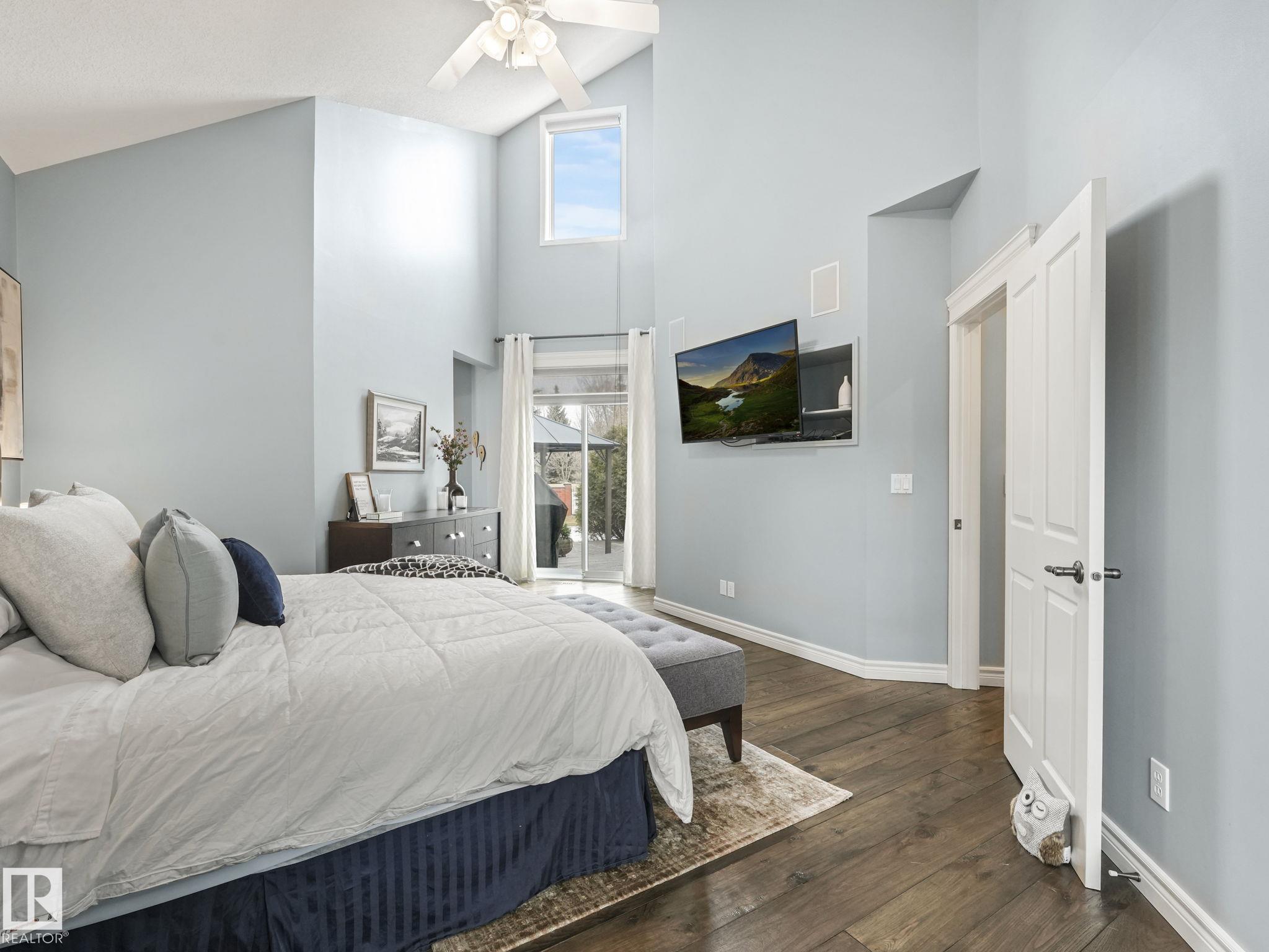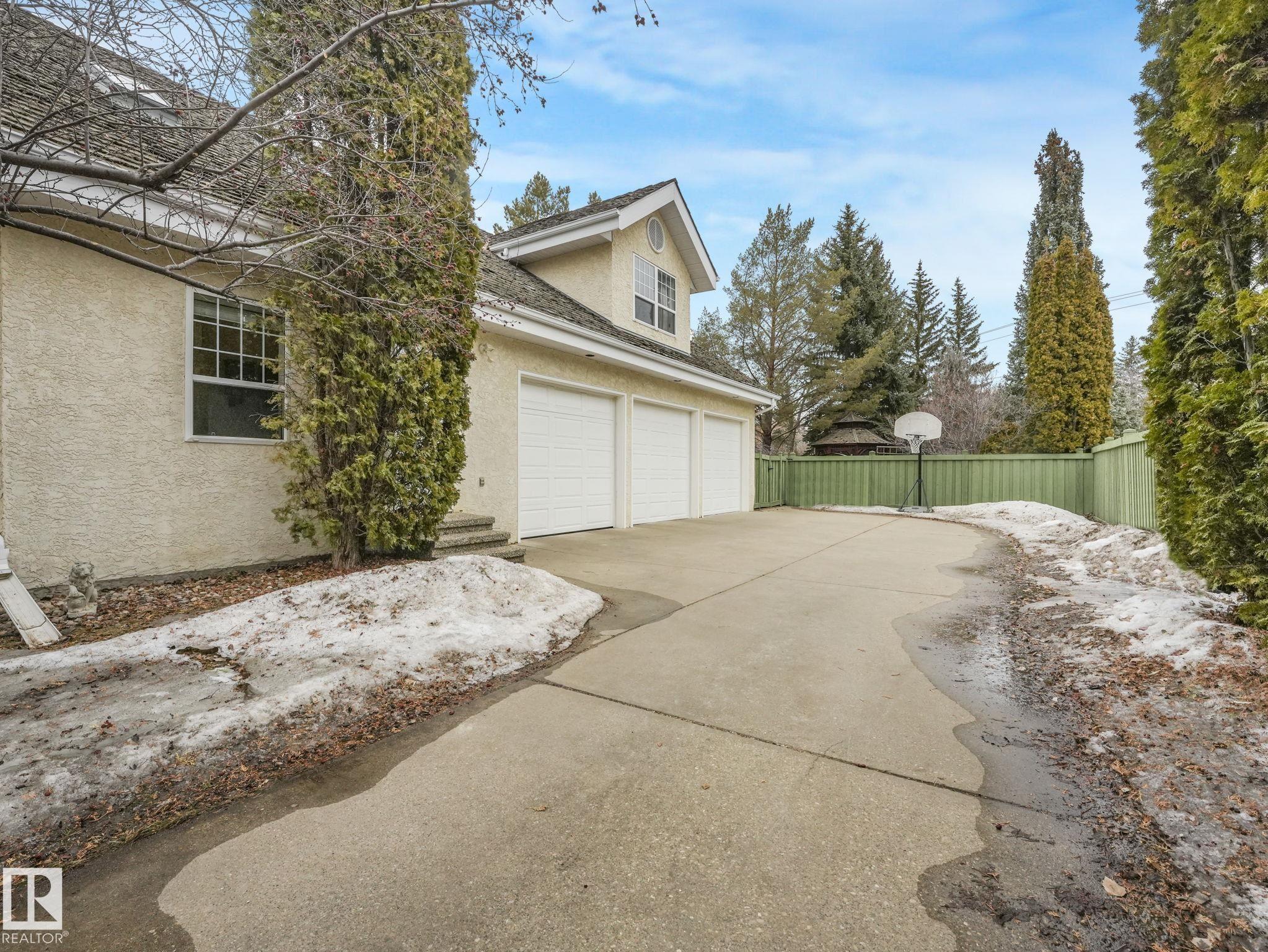Custom-built Executive home on a 15,289 sq ft pie-shaped cul-de-sac lot, adjacent to the Wedgewood Ravine in one of Edmonton's most prestigious neighbourhoods. This 3,821 sq ft above-grade masterpiece offers 6 bedrooms, 3 full and 2 half baths & a fully developed 2,017 sq ft basement — with 5800 sq ft of total living space. The rare main-floor primary suite boasts a spa ensuite with jetted soaker tub & multi-jet shower (2014). Soaring vaulted ceilings, 7 skylights, built-in speakers, intercom & 2 gas firep...