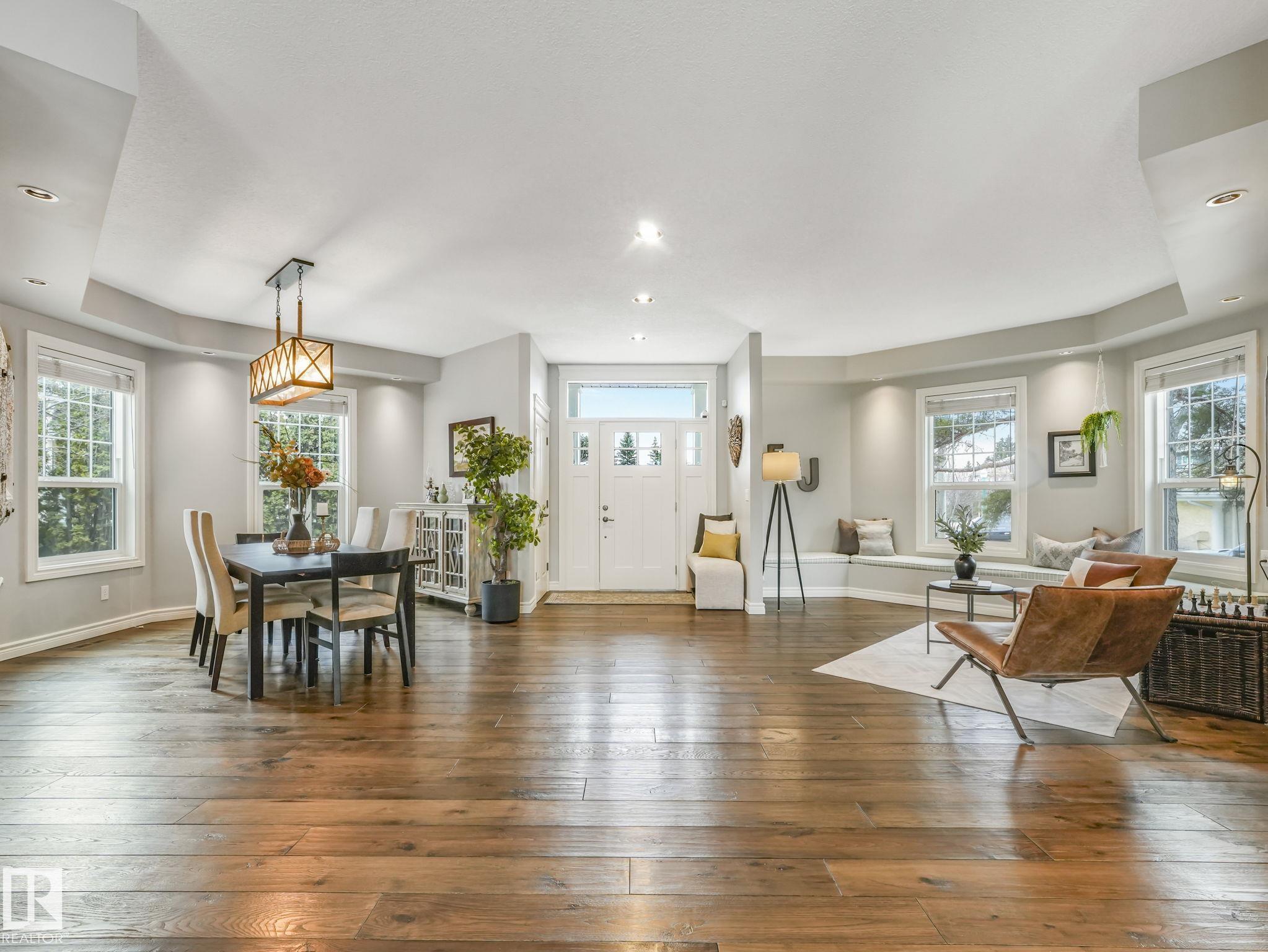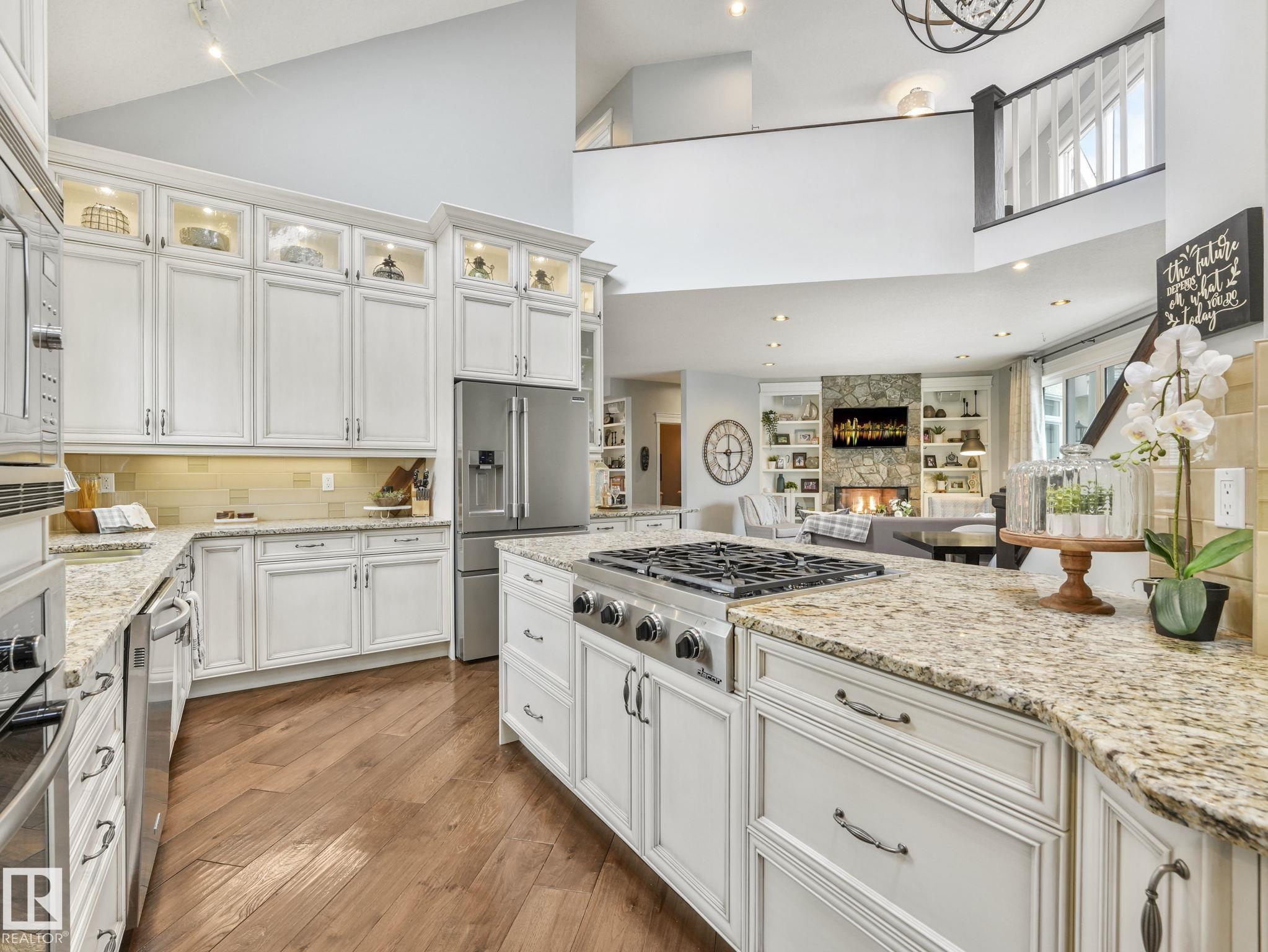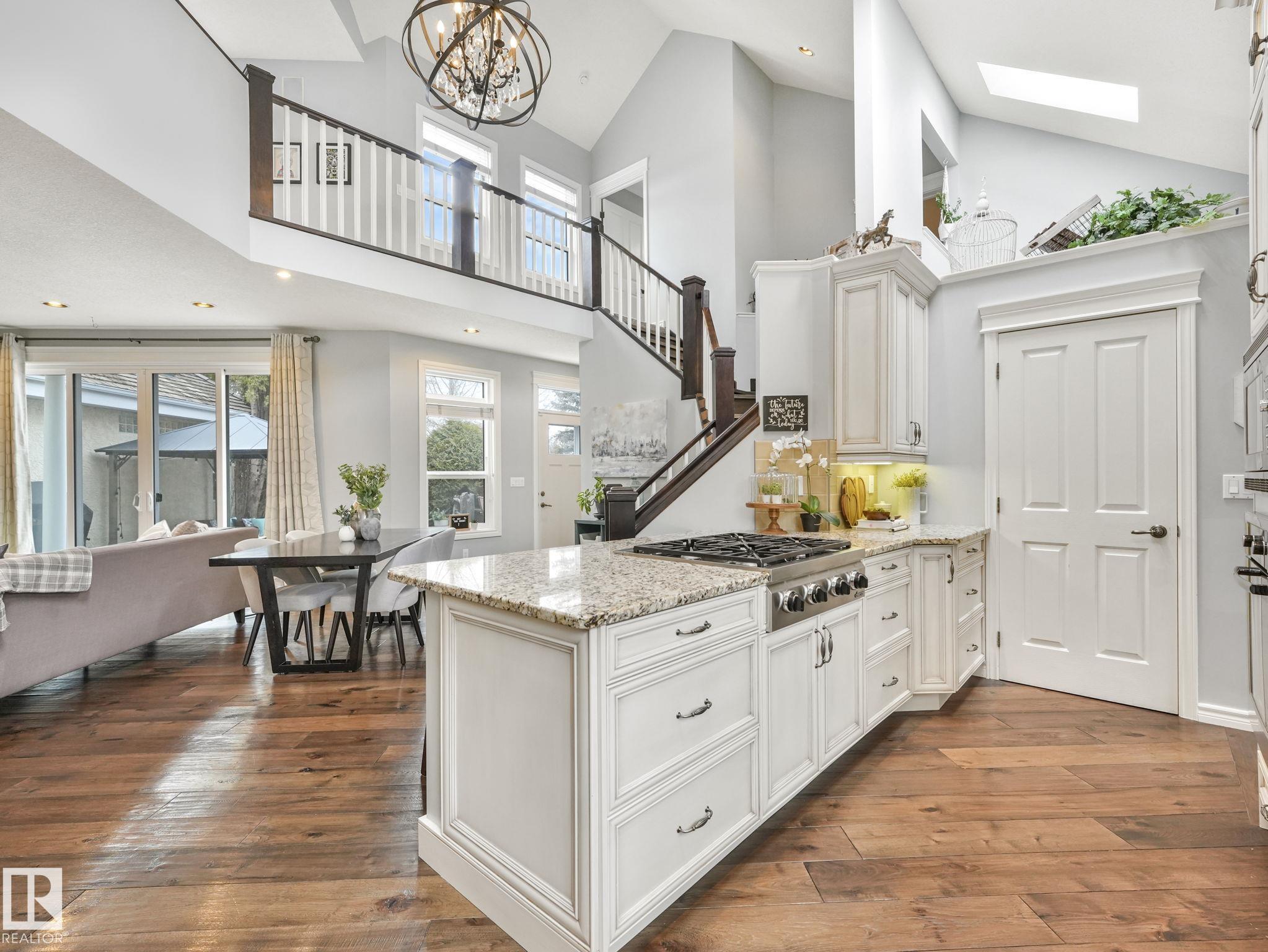 Custom-built Executive home on a 15,289 sq ft pie-shaped cul-de-sac lot, adjacent to the Wedgewood Ravine in one of Edmonton's most prestigious neighbourhoods. This 3,821 sq ft above-grade masterpiece offers 6 bedrooms, 3 full and 2 half baths & a fully developed 2,017 sq ft basement — with 5800 sq ft of total living space. The rare main-floor primary suite boasts a spa ensuite with jetted soaker tub & multi-jet shower (2014). Soaring vaulted ceilings, 7 skylights, built-in speakers, intercom & 2 gas firep...